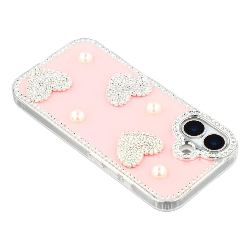 Esta funda para iPhone 16 combina una protección fiable para el día a día con un estilo glamuroso. Con brillantes diamantes de imitación alrededor de los bordes y adornos de corazón de perlas brillantes en la parte posterior, convierte tu iPhone 16 en un accesorio de moda mientras lo mantiene a salvo de arañazos y golpes.