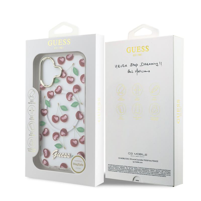 Añade un toque de glamour a tu protección diaria con la funda híbrida Guess IML Glitter Cherry MagSafe para iPhone 17. Diseñada para usuarios amantes de la moda, esta funda trasera de alta calidad combina PC resistente con TPU flexible para ofrecer una protección fiable y mantener un aspecto elegante y estilizado. El diseño de cerezas brillantes con el emblemático logotipo de Guess transforma tu teléfono en una pieza elegante y llamativa.