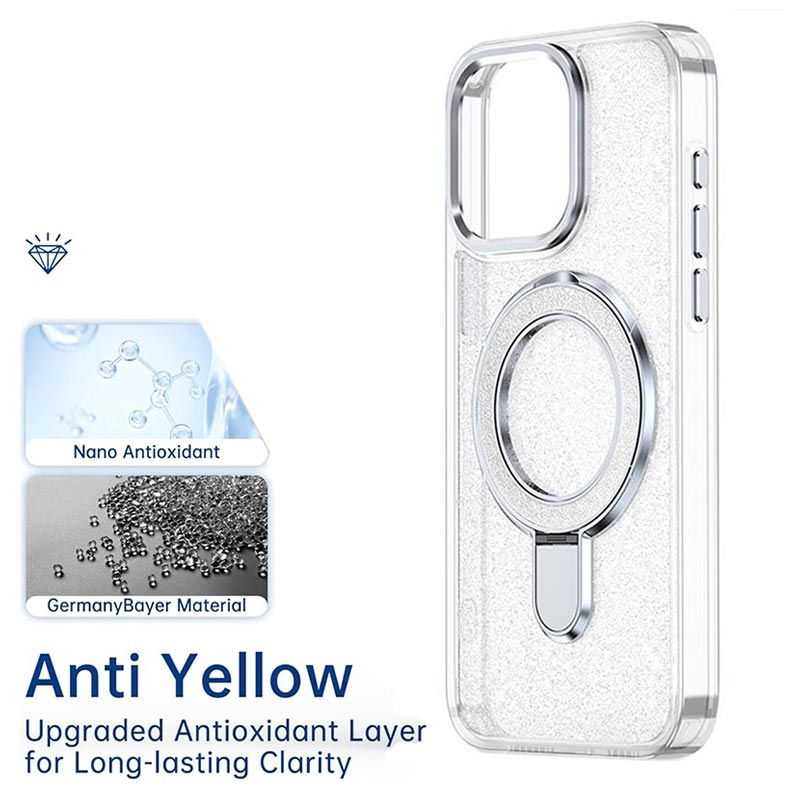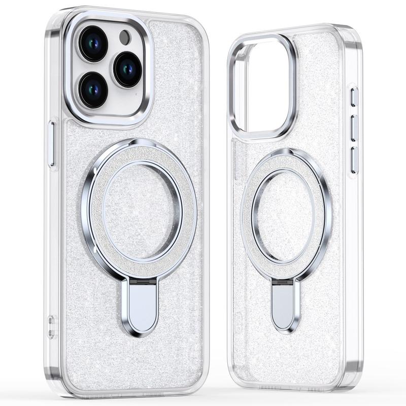 Funda híbrida iPhone 15 Pro Glitter con soporte - Compatible con MagSafe - Transparente