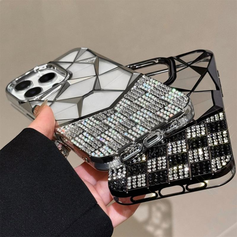 • Funda iPhone 16 Pro Max con diseño geométrico de diamantes - Cubierta de TPU electrochapado con decoración de pedrería y protección contra golpes