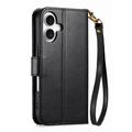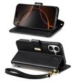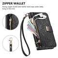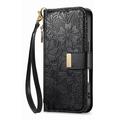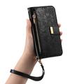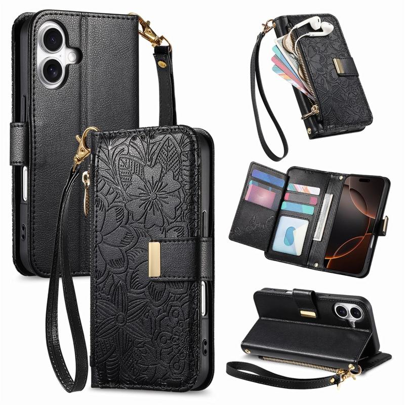 Funda iPhone 16 con estampado de flores y hojas, bolsillo con cremallera y correa para la muñeca