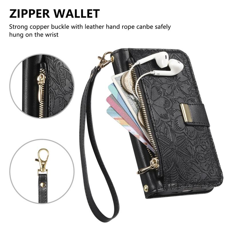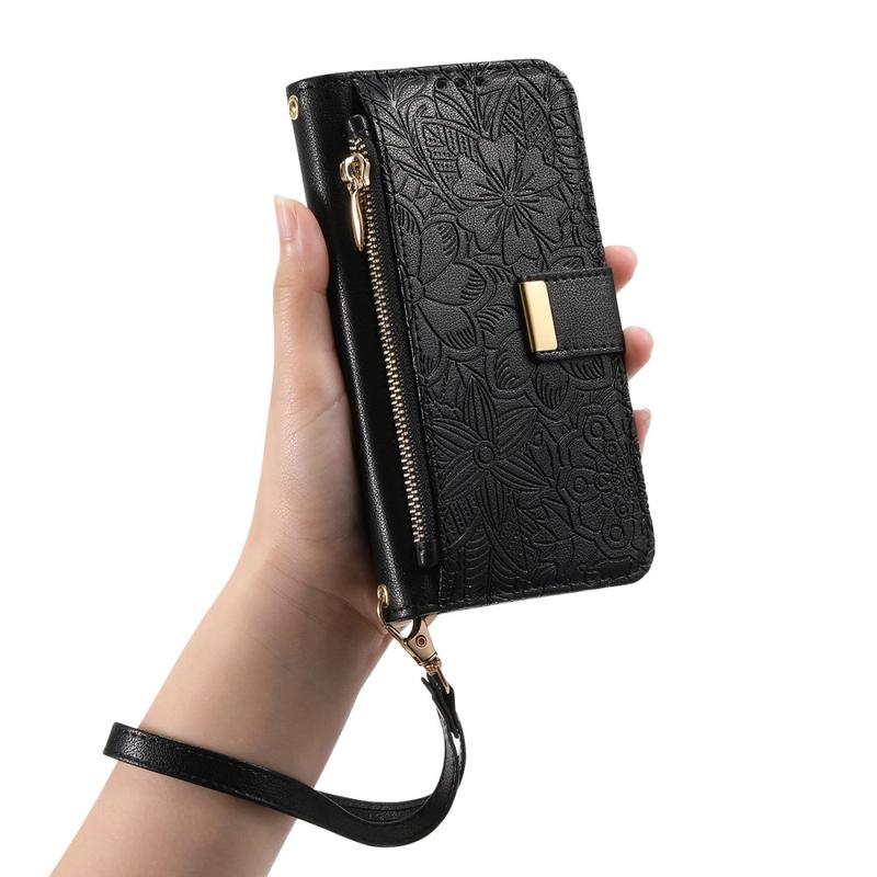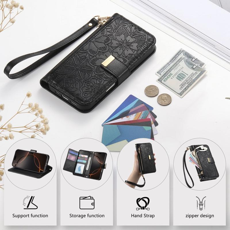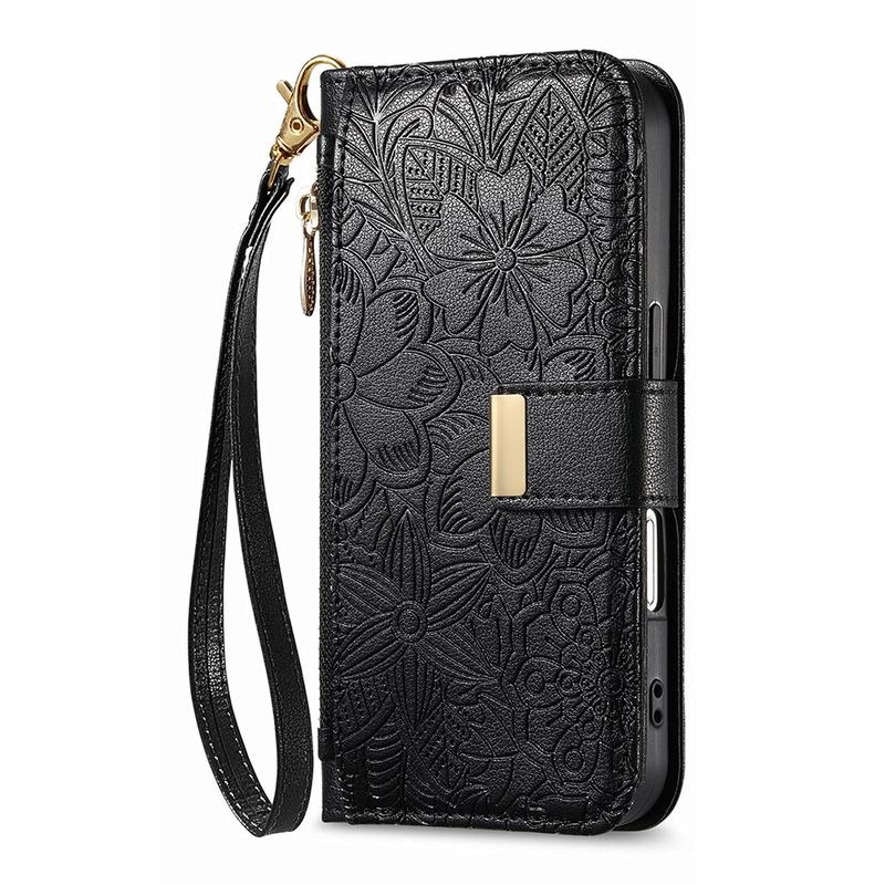 • Funda de cartera con estampado de flores y hojas, bolsillo con cremallera y correa para el iPhone 16