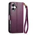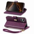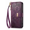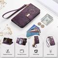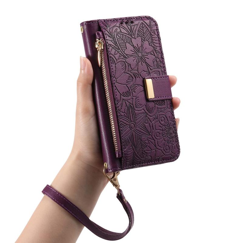 Funda iPhone 16 con estampado de flores y hojas, bolsillo con cremallera y correa para la muñeca - Violeta