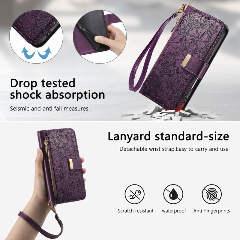 • Funda de cartera con estampado de flores y hojas, bolsillo con cremallera y correa para el iPhone 16