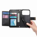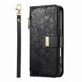 Funda iPhone 17 Pro con estampado de flores y hojas, bolsillo con cremallera y correa para la muñeca