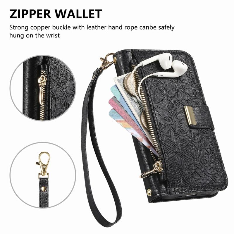 • Funda de cartera con estampado de flores y hojas, bolsillo con cremallera y correa para el iPhone 17 Pro