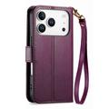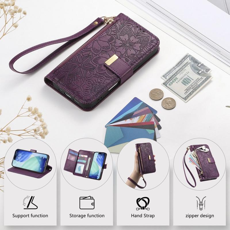 Funda iPhone 17 Pro con estampado de flores y hojas, bolsillo con cremallera y correa para la muñeca - Violeta