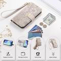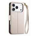 Funda iPhone 17 Pro con estampado de flores y hojas, bolsillo con cremallera y correa para la muñeca - Blanco