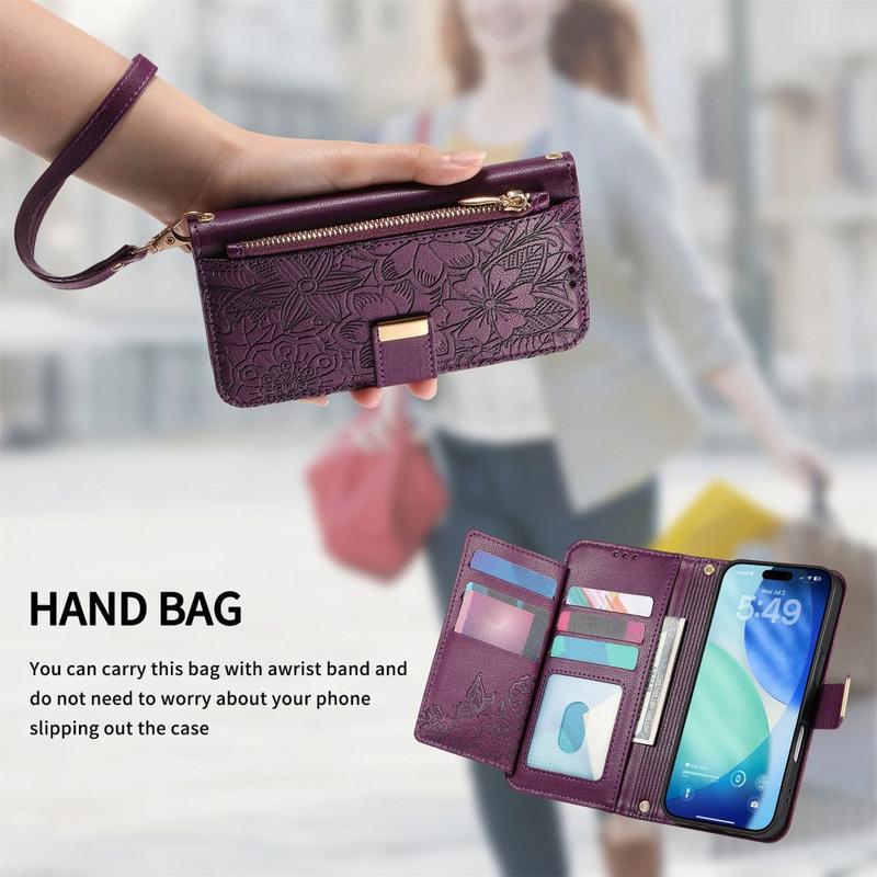 • Funda de cartera con estampado de flores y hojas, bolsillo con cremallera y correa para el iPhone 17 Pro Max