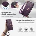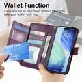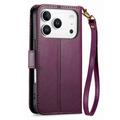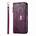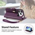 Funda iPhone 17 Pro Max con estampado de flores y hojas, bolsillo con cremallera y correa para la muñeca - Violeta