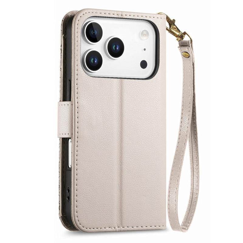 Funda iPhone 17 Pro Max con estampado de flores y hojas, bolsillo con cremallera y correa para la muñeca - Blanco