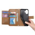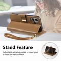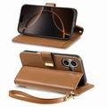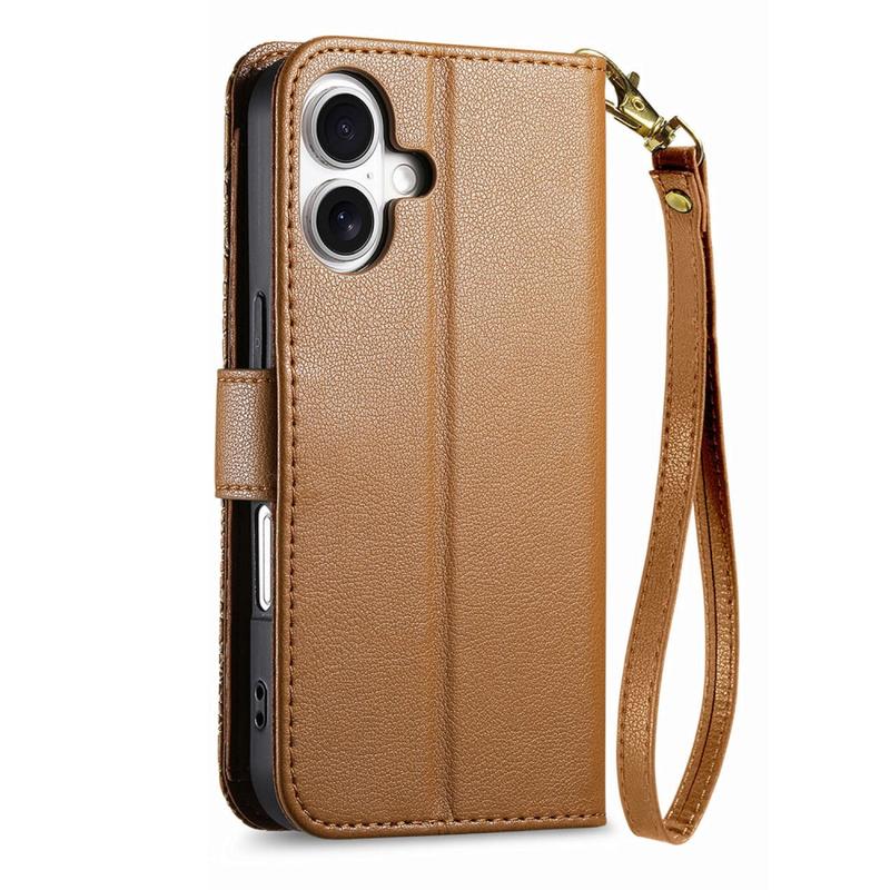 Funda para iPhone 17 con estampado de flores y hojas, bolsillo con cremallera y correa para la muñeca - Marrón