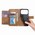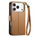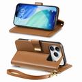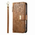 Funda para iPhone 17 Pro Max con estampado de flores y hojas, bolsillo con cremallera y correa para la muñeca - Marrón