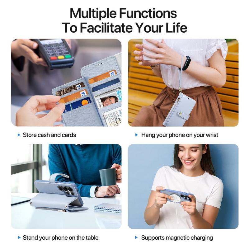 - Ideal para profesionales de negocios o viajeros que necesitan una funda de teléfono multifuncional