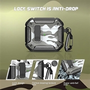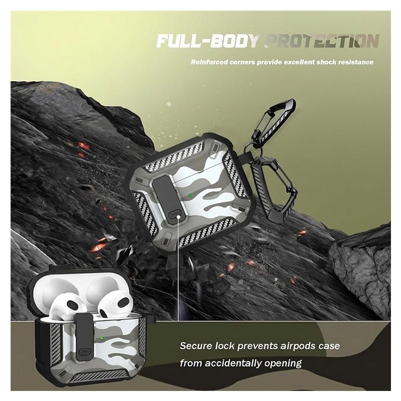 Funda de TPU a prueba de golpes con diseño de camuflaje y mosquetón para AirPods 4, compatible con la carga inalámbrica