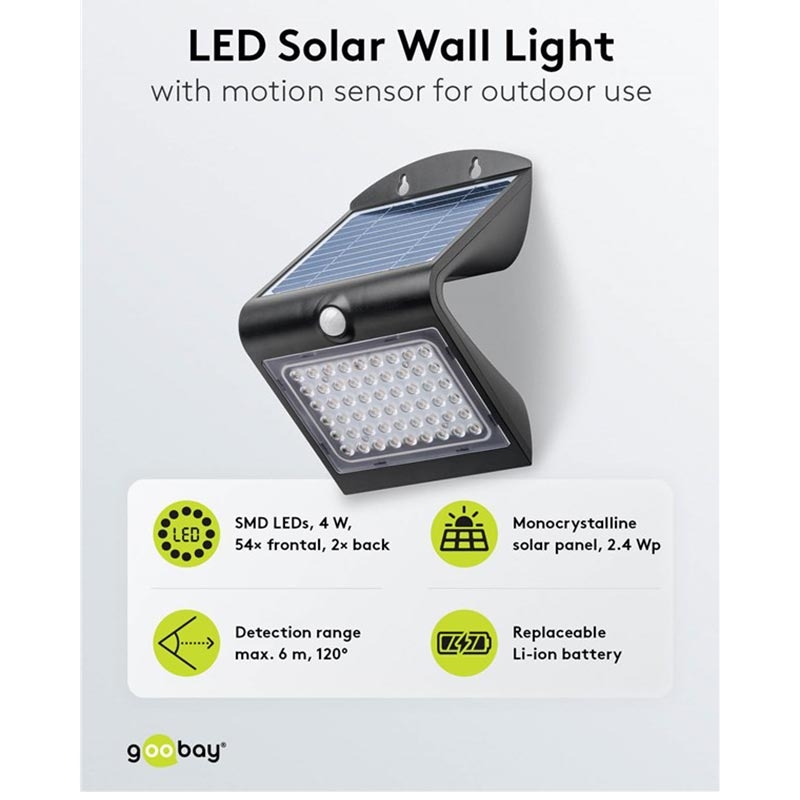 Goobay Aplique Solar LED 4W con Sensor de Movimiento PIR - Lámpara Solar de Exterior Resistente al Agua IP65 (500 lm, 4000K) - Batería Reemplazable