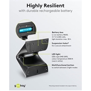 Alimentada por una batería Li-ion 18650 de 3,7 V y 2000 mAh, la linterna ofrece hasta 30 horas de iluminación con una carga completa. La batería reemplazable prolonga la vida útil y la sostenibilidad del producto.