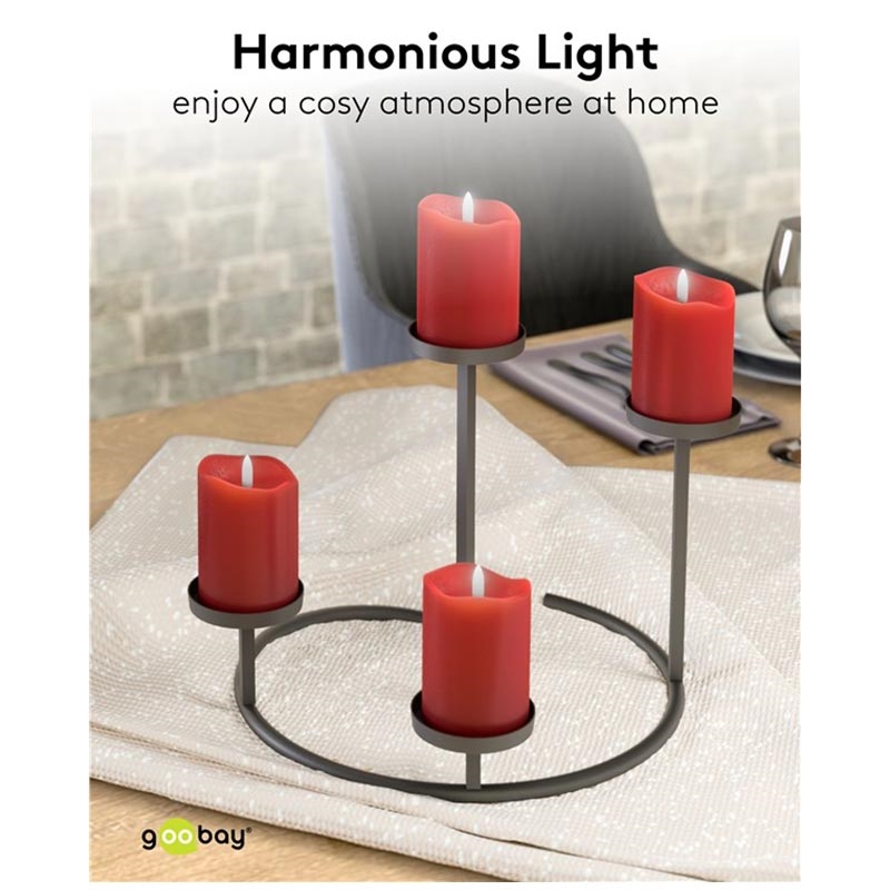Añade el encanto clásico de la luz de las velas a cualquier espacio con este set de 4 velas LED de cera auténtica Goobay. Fabricadas con cera auténtica y equipadas con conos de llama en 3D, crean un efecto parpadeante maravillosamente realista que captura la calidez de las velas tradicionales, sin hollín, calor ni riesgo de incendio. El cálido resplandor blanco de 2700 K proporciona una atmósfera acogedora adecuada para la decoración durante todo el año, desde cenas íntimas hasta festivas celebraciones navideñas. Con un temporizador automático de 6 horas y funcionamiento con pilas, estas velas ofrecen un ambiente sin esfuerzo allí donde las llamas reales no son seguras o no están permitidas.