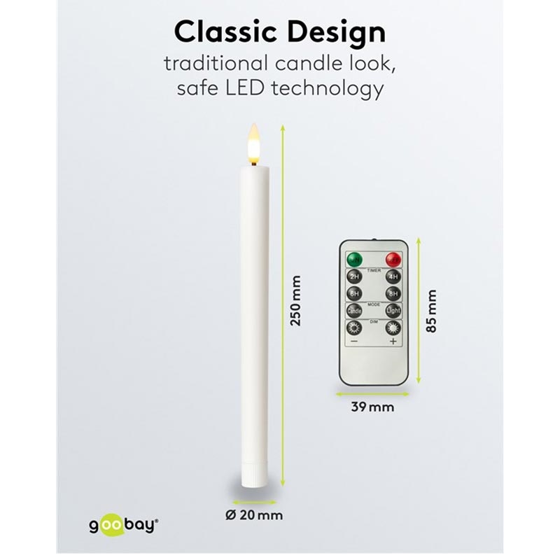 Disfruta de la belleza clásica de las elegantes velas cónicas con la seguridad y comodidad de la moderna tecnología LED. Este set de 5 velas LED de varilla de cera auténtica en color blanco proporciona un efecto de llama parpadeante natural a través de conos de llama en 3D y un cálido resplandor de 2400 K que imita la luz real de las velas. Estas velas, fabricadas con cera auténtica, crean un ambiente acogedor y agradable adecuado para cenas, reuniones festivas y decoraciones navideñas. Con opciones de atenuación, varios intervalos de temporizador y un mando a distancia con todas las funciones, las velas ofrecen un uso diario sin esfuerzo y son totalmente seguras para niños, mascotas y entornos delicados.