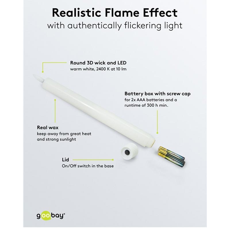 - Las velas LED de cera real tienen un aspecto y un tacto auténticos, pero deben mantenerse alejadas de la luz solar intensa para evitar que se ablanden.