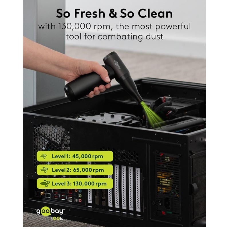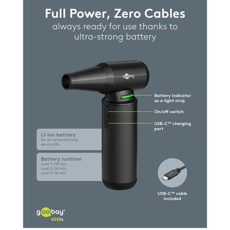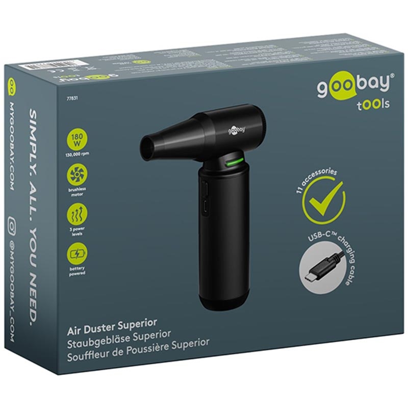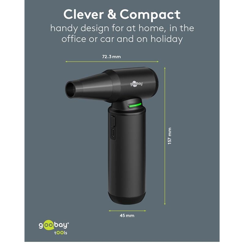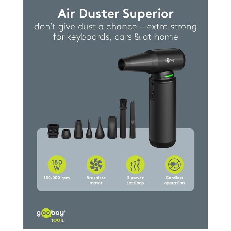Goobay Plumero de aire inalámbrico Superior - 130000rpm soplador de aire eléctrico inalámbrico con 8 boquillas y 3 cepillos (180 W, diseño de aluminio)