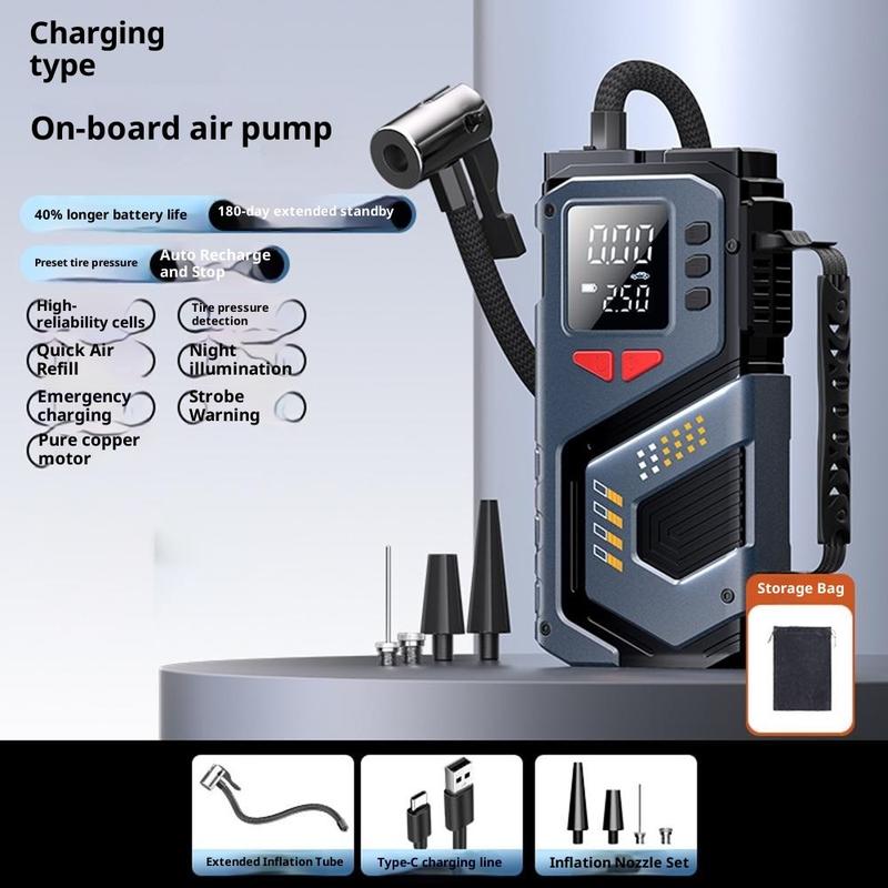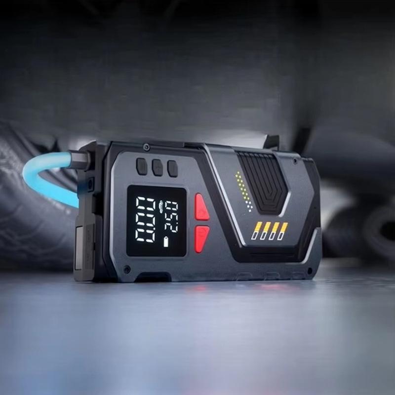- Herramienta de emergencia todo en uno - Combina las funciones de arrancador, inflador de neumáticos, manómetro digital, luz SOS y linterna en un solo dispositivo portátil.