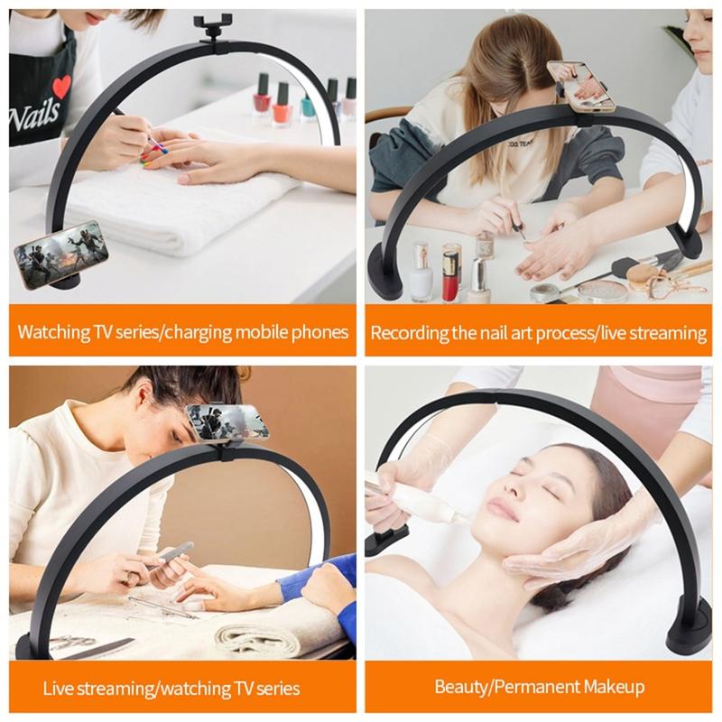 Cree una luz limpia y favorecedora para trabajos de precisión con la luz de relleno LED sin sombras en forma de U HD-M11X de 28 pulgadas. Su diseño semicircular ayuda a reducir las sombras duras, por lo que es ideal para tratamientos de belleza, decoración de uñas, tatuajes, creación de contenidos y tareas de escritorio minuciosas. Con 280 LED de doble color, puede cambiar entre tonos cálidos y fríos y ajustar el ambiente de 3200K a 5600K. Un alto CRI >90 ayuda a que los colores parezcan naturales y precisos, lo que resulta especialmente útil a la hora de igualar tonos de maquillaje, elegir colores de uñas o trabajar con tonos de piel. La lámpara proporciona hasta 2.500 lm de brillo con 40 W, e incluye soportes de sobremesa y un juego de accesorios de soporte de teléfono para una configuración ordenada de la estación de trabajo.