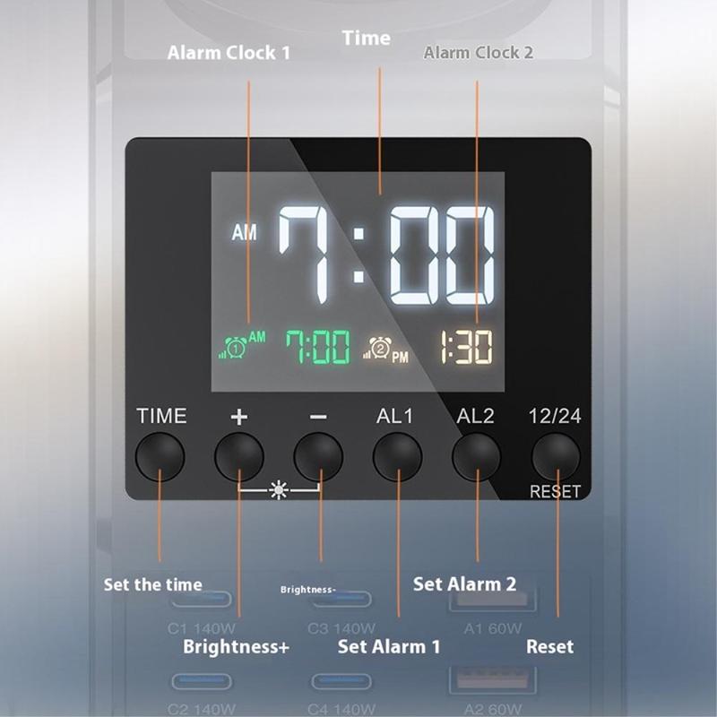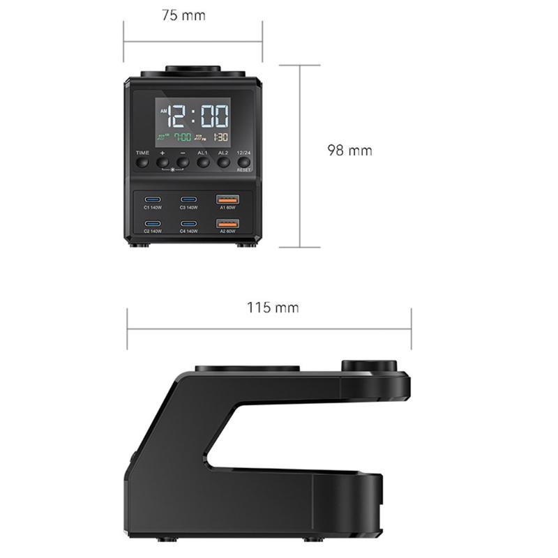 - Diseño multifuncional 6 en 1 - Combina reloj despertador, cargador inalámbrico y estación de alimentación multipuerto.