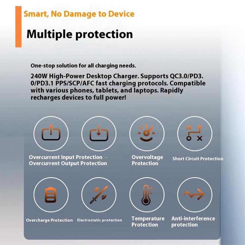 La tecnología PD 3.1 permite una potencia de salida de hasta 240W, suficiente para cargar no solo teléfonos, sino incluso portátiles de alto rendimiento y consolas de juegos portátiles, al tiempo que mantiene una regulación segura de la temperatura y el voltaje para prolongar la vida útil del dispositivo.
