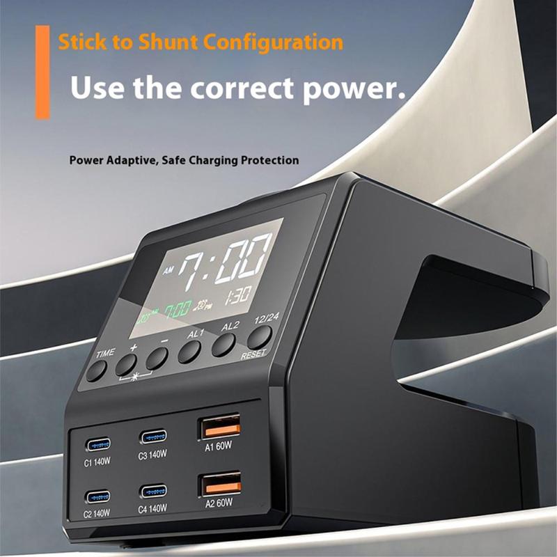 Equipada con cuatro puertos Tipo-C (cada uno soporta hasta 140 W) y dos puertos USB-A (hasta 60 W), esta estación alimenta fácilmente seis dispositivos al mismo tiempo. Desde portátiles y tabletas hasta wearables y accesorios, cada puerto está diseñado para ofrecer el máximo rendimiento y distribución de energía.