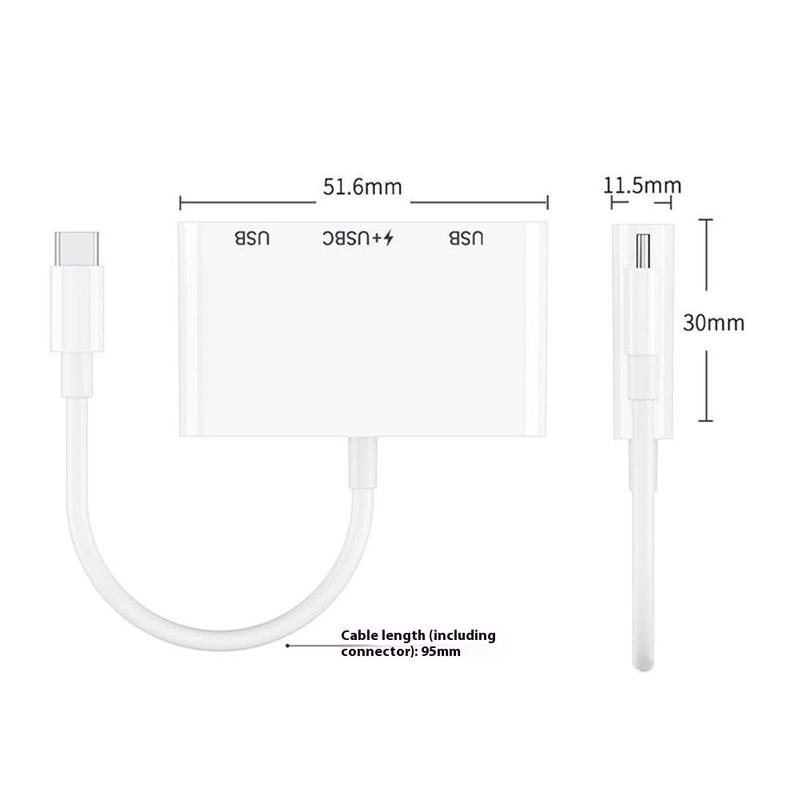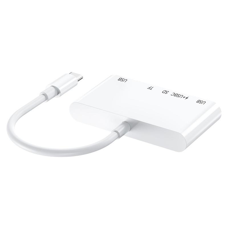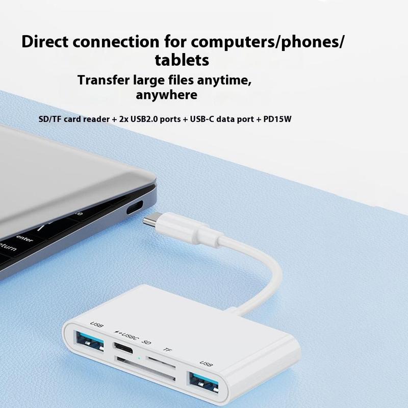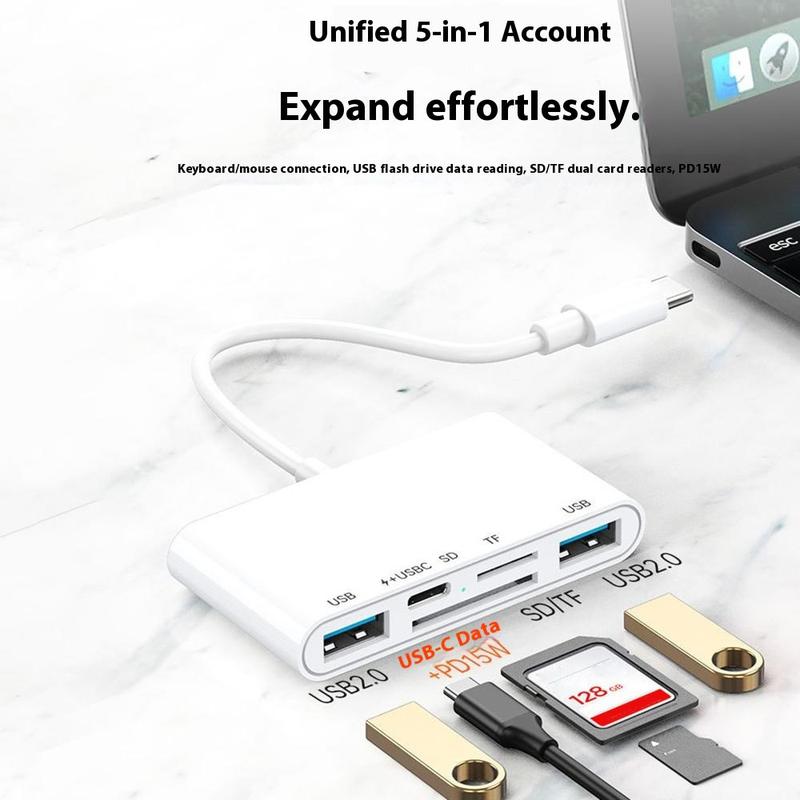 Adaptador OTG USB-C 5 en 1 - Hub USB-C con doble USB 2.0, carga PD de 15 W y lector de tarjetas SD/TF para iPhone, MacBook y dispositivos USB-C.
