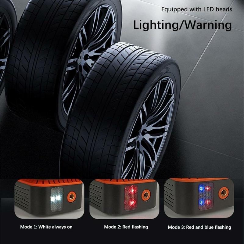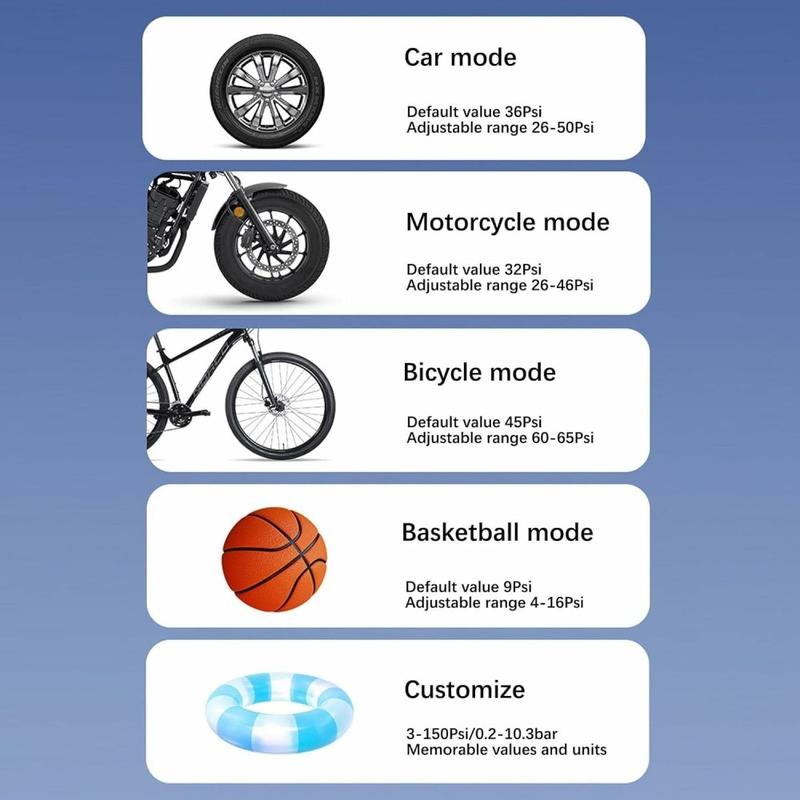 - Potencia de alta presión: Infla hasta 150 PSI, adecuado para una amplia gama de tamaños de neumáticos.