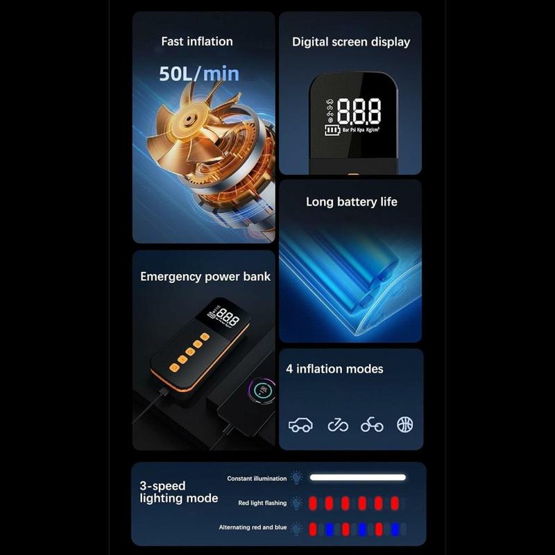 A diferencia de los voluminosos compresores de aire tradicionales, este inflador digital inalámbrico es ligero, portátil y fácil de usar. Su pantalla inteligente, sus modos preestablecidos y su potente velocidad de inflado lo convierten en un compañero práctico para una conducción segura y un estilo de vida activo.
