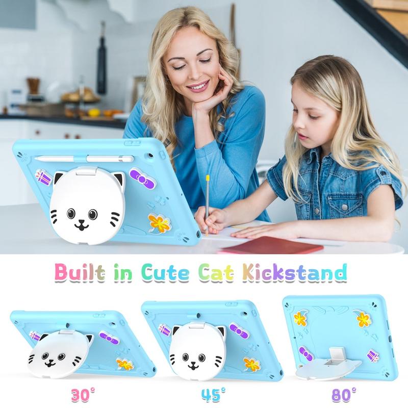 iPad 10.2 2019/2020/2021 Funda híbrida con un simpático gato y soporte - Azul claro