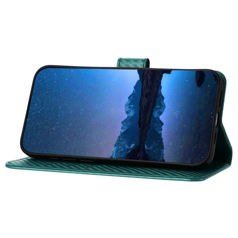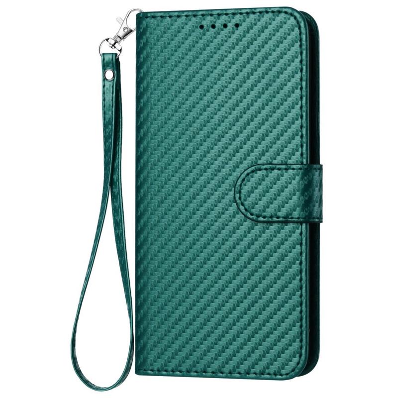 iPhone 15 Pro Funda Cartera Premium con Correa - Textura Fibra de Carbono - Verde carbón