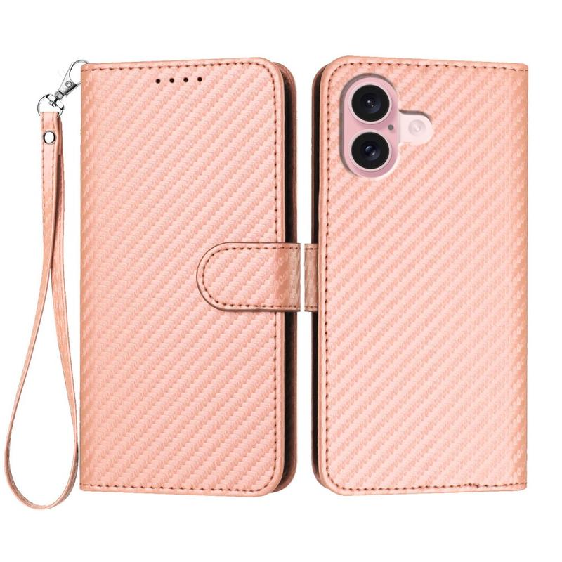 iPhone 16 Funda Cartera Premium con Correa - Textura Fibra de Carbono - Rosa carbón