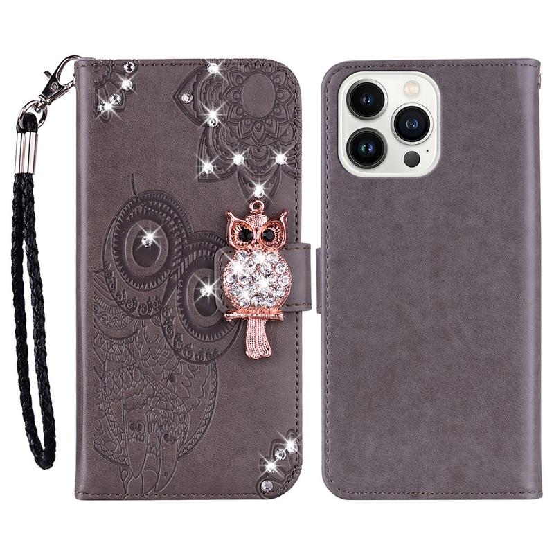 iPhone 16 Pro Búho Rhinestone Funda Billetera - Gris