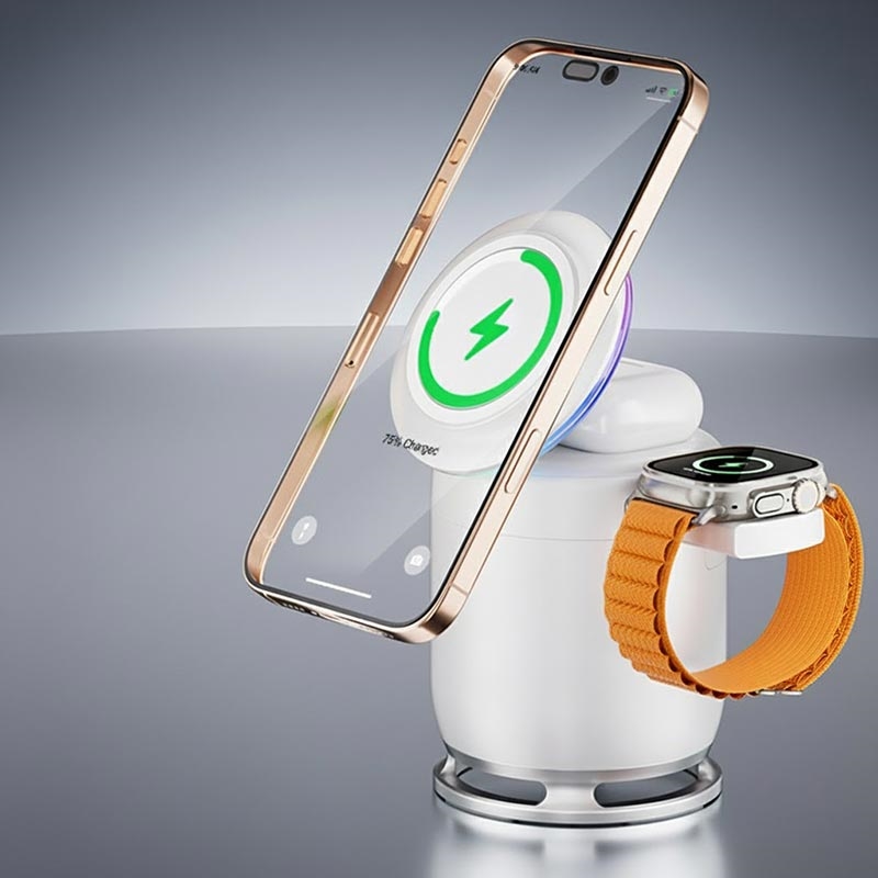 - Carga 3 en 1: teléfono de 15W + reloj de 2,5W + auriculares de 5W simultáneamente