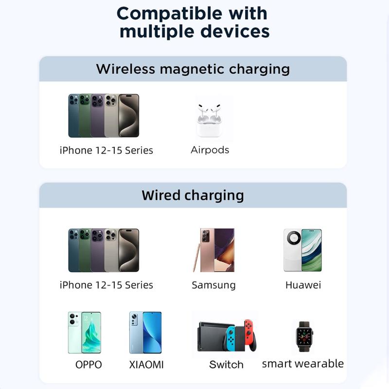 Viene con un cable desmontable, puede cargar tres dispositivos con un solo cable, incluyendo para los dispositivos de Apple / Android / auto-carga
