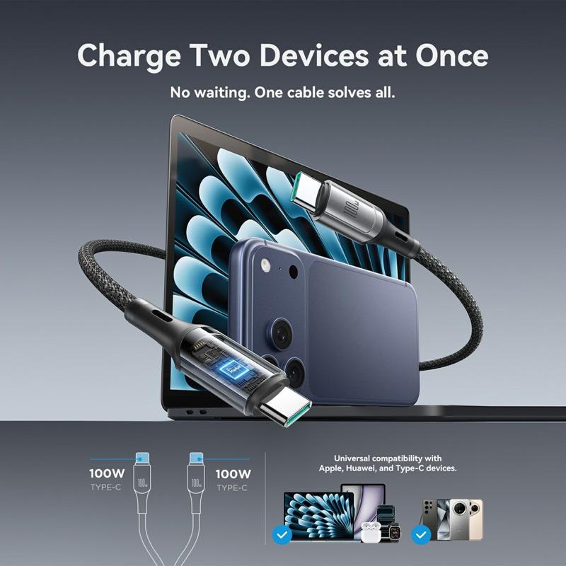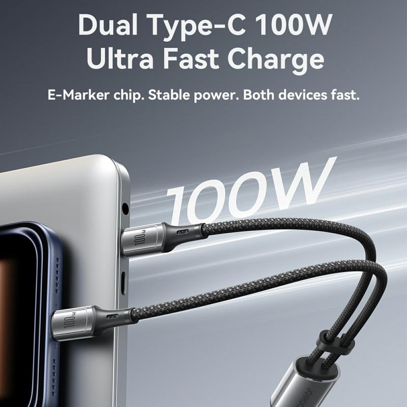 Carga dos dispositivos USB-C al mismo tiempo con el cable JOYROOM S-A57 USB-C a USB-C dual. Diseñado para portátiles, tabletas y smartphones modernos, admite una carga rápida de hasta 100 W y utiliza un chip de gestión inteligente E-Marker para ayudar a suministrar energía estable a los dispositivos compatibles. También ofrece una transferencia de datos de 480 Mbps para la sincronización diaria, por lo que un solo cable cubre tanto la carga como la transferencia de archivos. El duradero trenzado de nailon de 48 hebras está diseñado para resistir la abrasión y el doblado diario, mientras que el organizador de cables incluido mantiene la configuración ordenada en el escritorio o en el bolso. Con características de durabilidad probadas, como más de 10.000 inserciones y una capacidad de carga de 7 kg, está hecho para un uso frecuente.