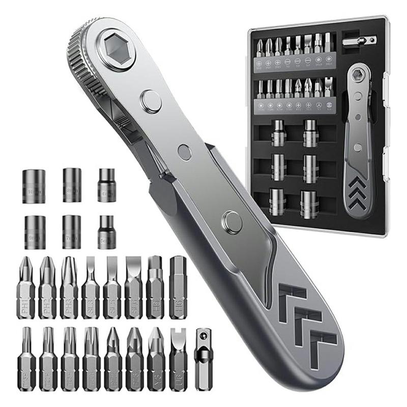 Este juego de destornilladores es una excelente opción para cualquiera que busque una herramienta de reparación más versátil, tanto para espacios reducidos como para tareas cotidianas. El diseño de trinquete en ángulo recto facilita mucho los trabajos complicados, mientras que las puntas y los casquillos incluidos te ofrecen una cobertura práctica para una amplia gama de reparaciones.