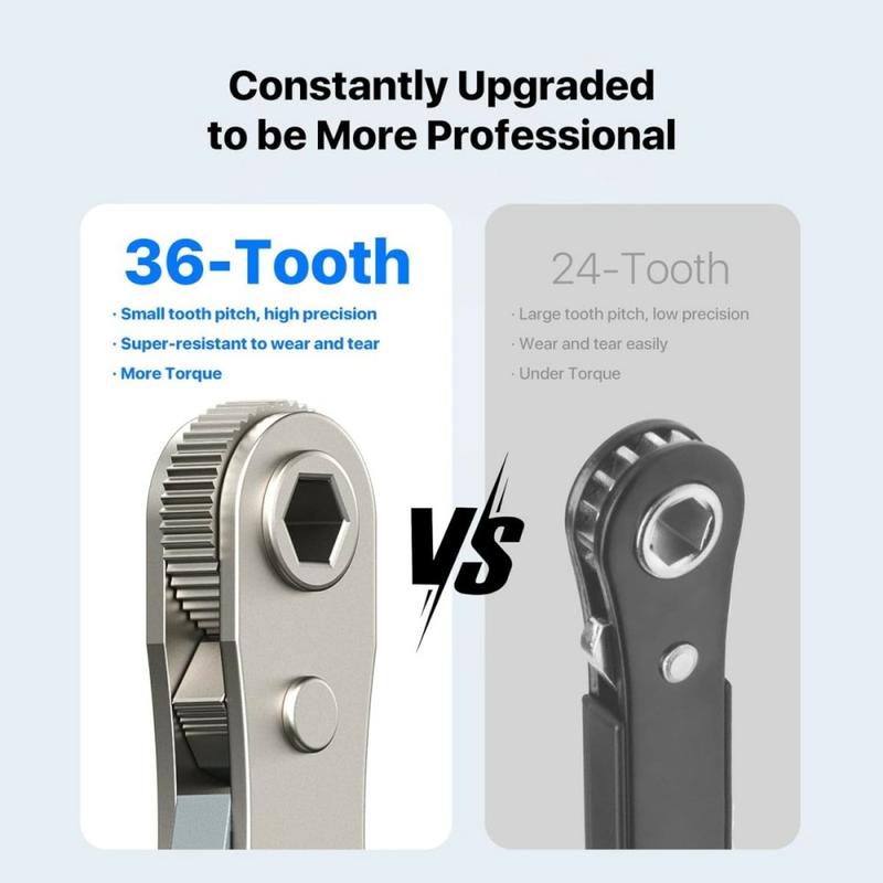 El diseño en ángulo recto facilita mucho el trabajo en espacios estrechos donde un destornillador estándar no puede moverse con libertad. Con su mecanismo de trinquete de 36 dientes, la herramienta ofrece un giro más suave con un arco de oscilación menor, lo que ayuda a mejorar el control y a reducir la fatiga de la mano durante el uso repetido. También se puede utilizar en modo recto, lo que te proporciona una flexibilidad adicional para tareas de reparación más convencionales.