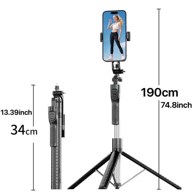 - Diseño versátil 2 en 1: Utilízalo como palo selfie o trípode, extensible hasta 190 cm para tomas de grupo, vlogs y grabaciones aéreas.