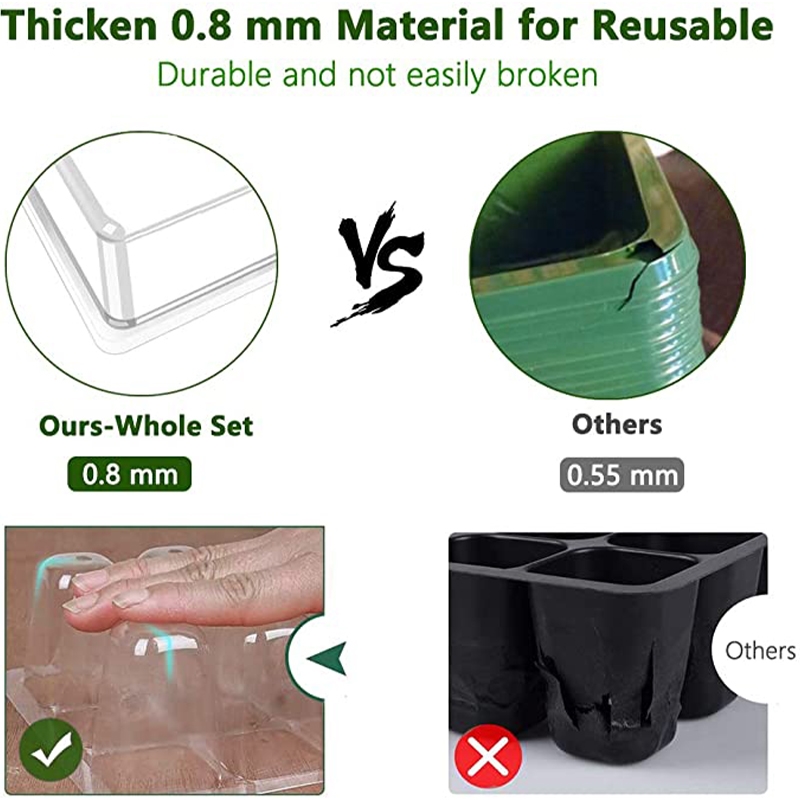 A diferencia de las bandejas finas de 0,5 mm, este diseño mejorado de 0,8 mm ofrece una durabilidad, reutilización y resistencia al alabeo superiores, lo que resulta ideal para varias temporadas de cultivo.