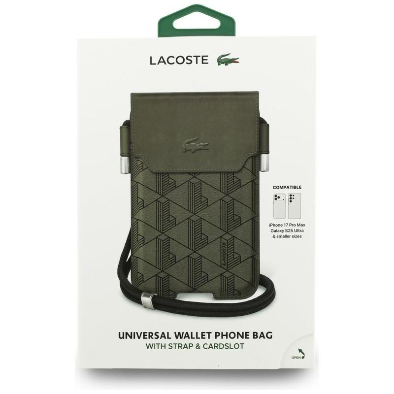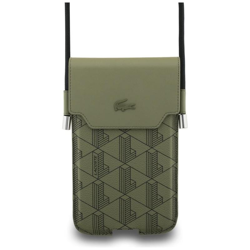 Confeccionada en poliuretano texturizado, la bolsa luce el monograma característico de la marca y el icónico logo del cocodrilo bordado. El cierre magnético de la solapa mantiene el teléfono en su sitio, mientras que los cuidados detalles garantizan un fácil acceso y un uso diario sin problemas.