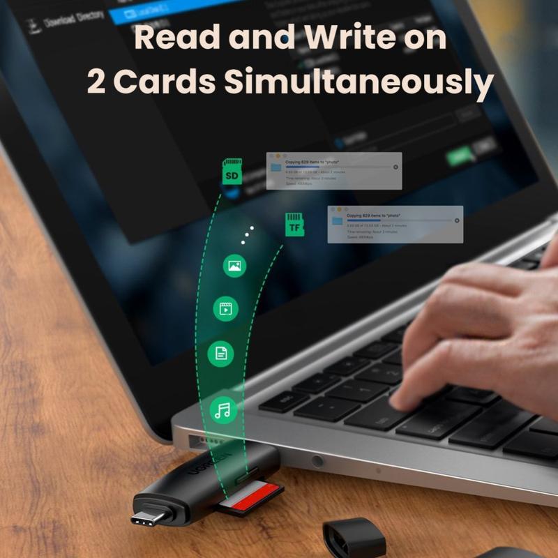 Transfiere fotos y vídeos más rápido estés donde estés con el lector de tarjetas SD y microSD 2 en 1 de UGREEN. Fabricado con conectores USB-A y USB-C, funciona con una amplia gama de ordenadores portátiles, PC y teléfonos y tabletas compatibles con OTG, lo que lo hace ideal para viajar, crear contenido y realizar copias de seguridad rápidas. Las dos ranuras para tarjetas te permiten leer y escribir en tarjetas SD y microSD al mismo tiempo, para que puedas copiar archivos, previsualizar contenidos o mover datos entre tarjetas sin tener que cambiar de adaptador.