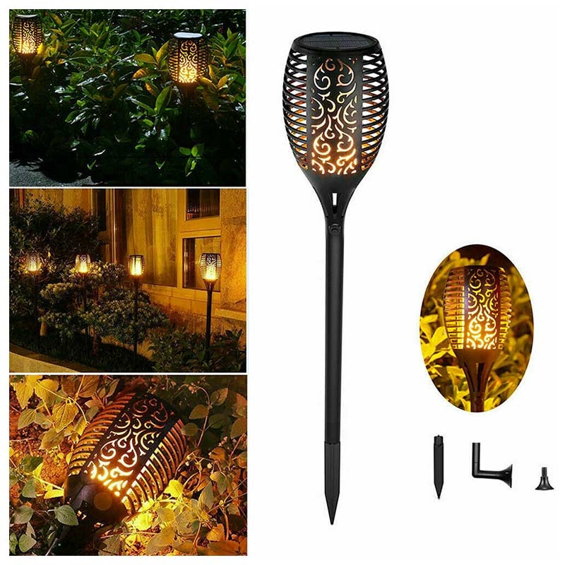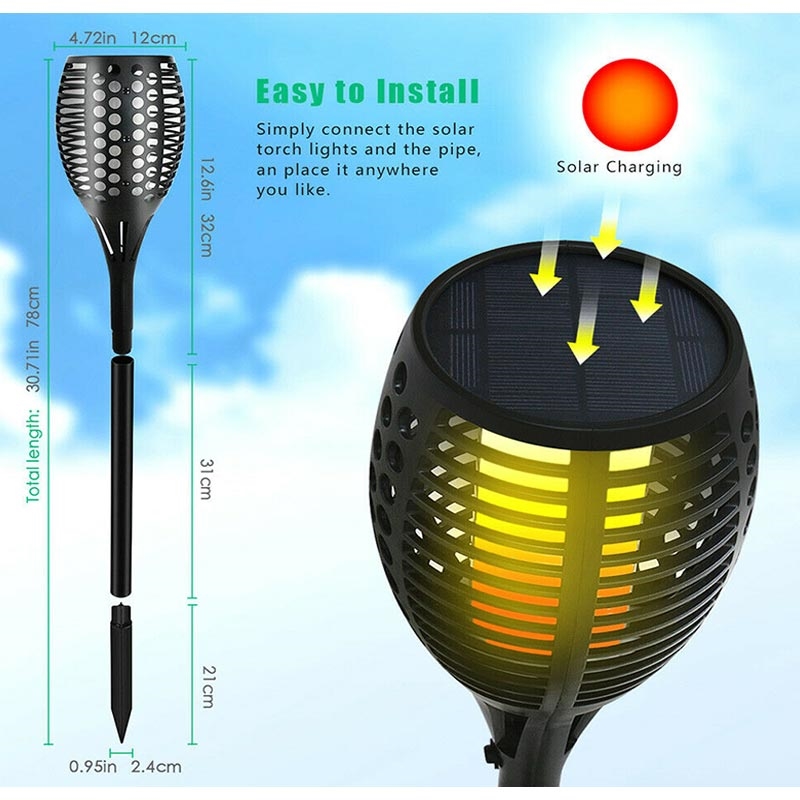 Ofrecen una hermosa iluminación de llama parpadeante con una larga duración, fácil instalación y energía solar completa, perfecta para mejorar los espacios al aire libre.