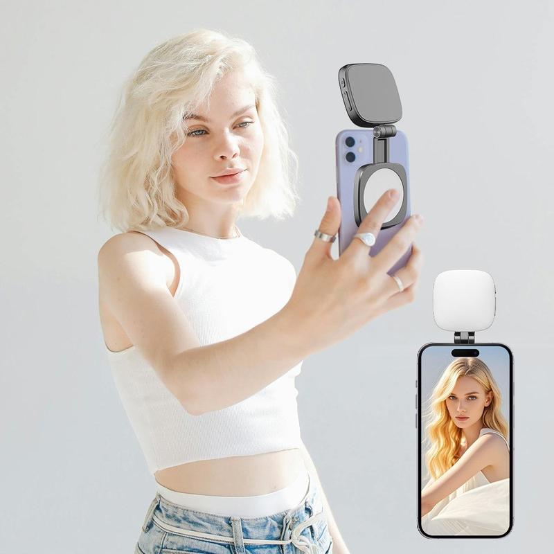 Consigue una iluminación perfecta en cualquier momento con esta luz de relleno LED magnética 2 en 1 para selfies, diseñada para smartphones y fotografía sobre la marcha. Las perlas LED de alta calidad proporcionan una iluminación suave y uniforme que mejora los selfies, retratos y videollamadas en entornos con poca luz. Gracias a su sujeción magnética inteligente, la lámpara se fija de forma segura al dispositivo para utilizarla con las manos libres, mientras que el espejo de maquillaje integrado permite hacer retoques rápidos antes de filmar o disparar. Con una batería recargable integrada y un diseño compacto de 149 g, este accesorio de iluminación portátil es ideal para viajes, vlogging, livestreaming y fotografía móvil cotidiana.