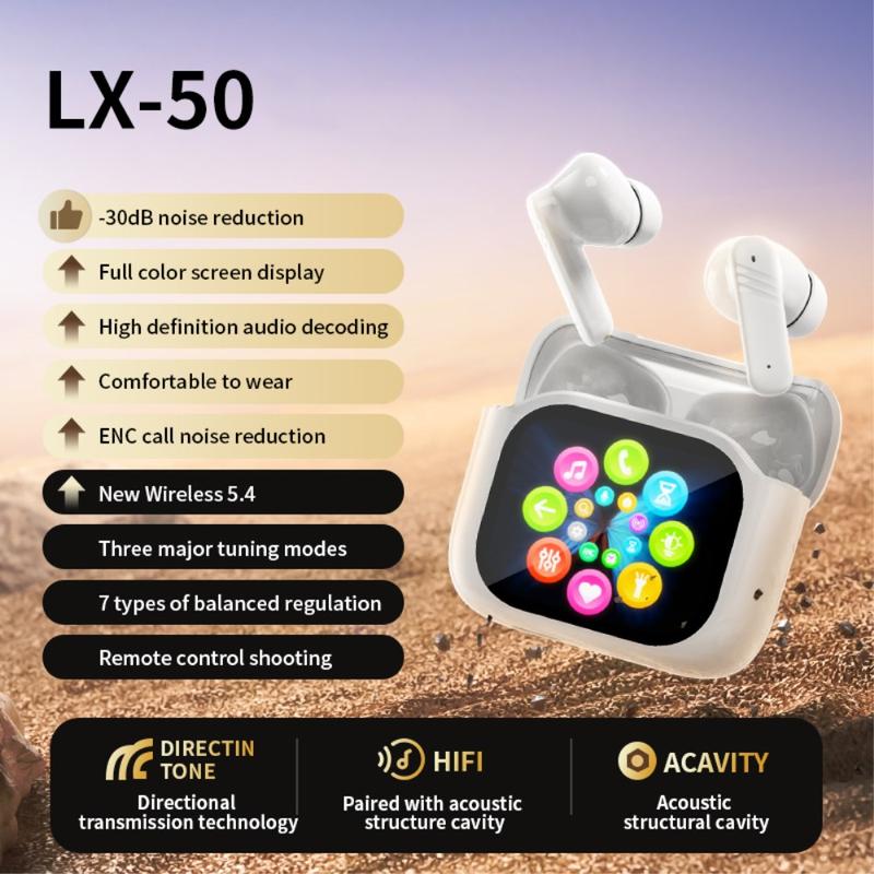 Los auriculares inalámbricos LX-50 combinan control inteligente, reducción eficaz del ruido y sonido envolvente en un moderno diseño intraauricular. La característica más destacada es la pantalla táctil HD a todo color integrada en el estuche de carga, que permite controlar los ajustes, modos y funciones directamente, sin necesidad de teléfono. Con doble cancelación de ruido, conectividad Bluetooth 5.4 estable y un cómodo ajuste ergonómico, los auriculares LX-50 están diseñados para la escucha diaria, las llamadas y la comodidad sobre la marcha.