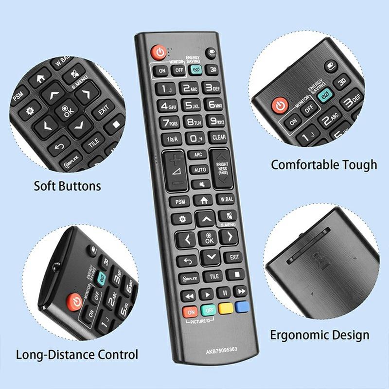 Este mando a distancia AKB75095363 es el reemplazo ideal para el mando a distancia de su televisor LG: fácil de configurar, duradero y fiable. Si su mando a distancia original se ha perdido, roto o simplemente desgastado, este reemplazo restaura la funcionalidad completa sin problemas.
